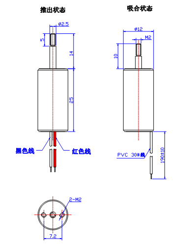 產(chǎn)品尺寸:直徑12mm * 高度25mm 頂 桿直徑2.5mm 螺紋為M2
