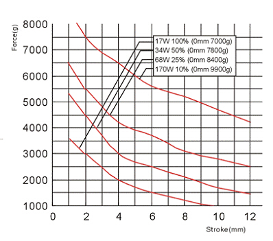 力量曲線圖圖解:T6490力量曲線圖中分別是10%、25%、50%、100%通電時行程和力量的曲線圖,其中橫向軸代表的是行程(mm),縱向軸代表的是力量(g)。